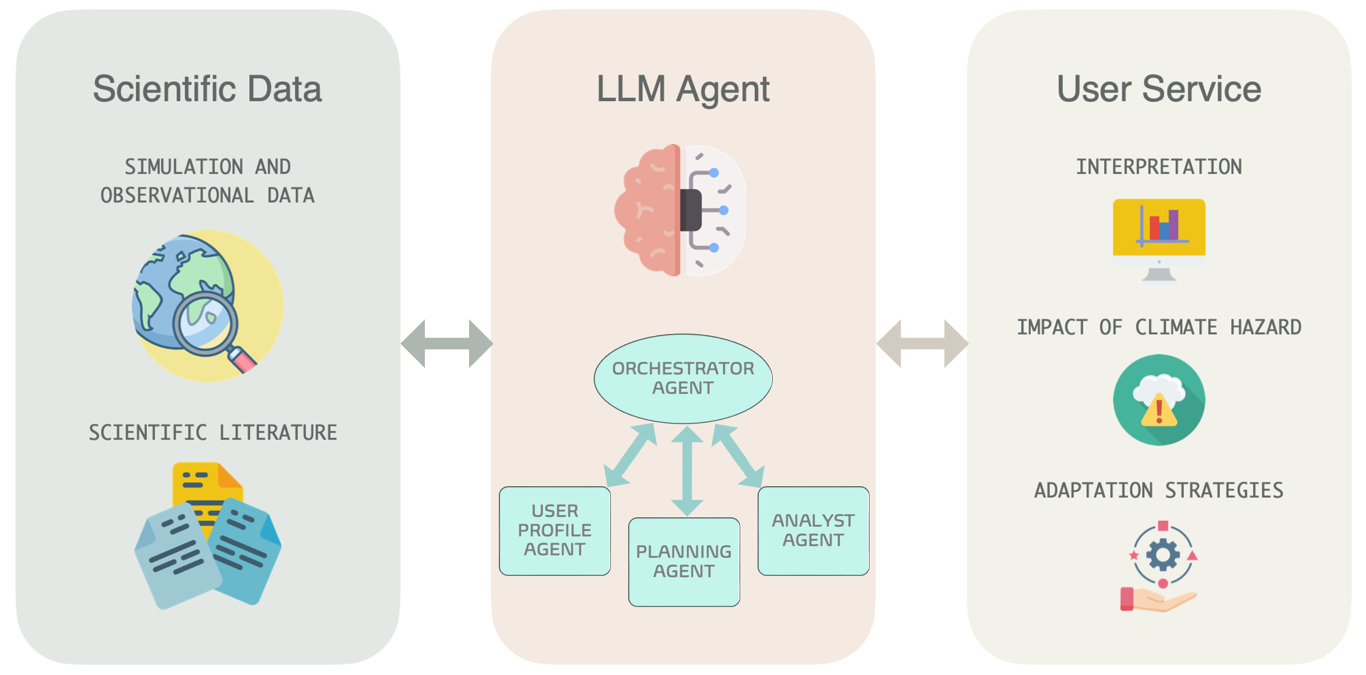 Heterogeneous scientific data (simulations, observations, literature) are ingested and reasoned over by LLM agents to generate interpretable insights on climate hazard impacts and adaptation strategies for users.